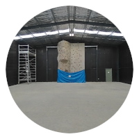 Has an indoor rock climbing wall, and basketball ring.
